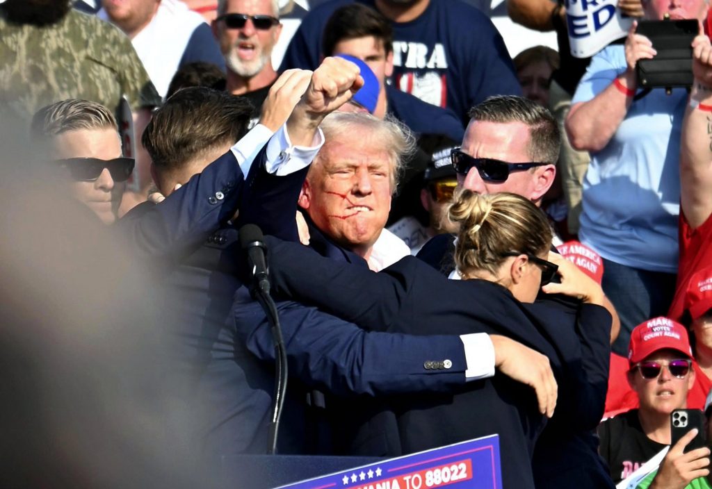 Είκοσι τέσσερις ώρες μετά την απόπειρα δολοφονίας του, ο Ντόναλντ Τραμπ κατεβαίνει τις σκάλες του αεροπλάνου στο Ουισκόνσιν, για το συνέδριο των Ρεπουμπλικανών. Υψώνει, ξανά τη γροθιά του, υποστηρίζοντας πως σώθηκε με θεϊκή παρέμβαση.