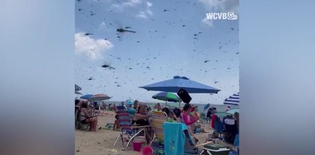 Στο βίντεο φαίνονται οι λιβελούλες να περνάνε ανάμεσα από τους λουόμενους, με τους ίδιους να πανικοβάλλονται και να τρέπονται σε φυγή ουρλιάζοντας.