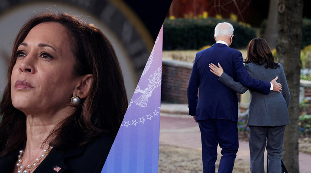 Ο Αμερικανός πρόεδρος αποχωρεί από τα δεξιά, με τη μορφή του μόλις να διακρίνεται, ενώ από την αντίθετη κατεύθυνση, μπαίνει στο κάδρο η αντιπρόεδρος Χάρις.