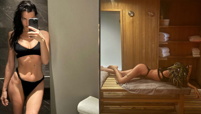 Στην πρώτη φωτογραφία, η Irina Shayk φαίνεται ξαπλωμένη σε ένα κρεβάτι μασάζ, φορώντας μόνο το μαγιό της και έχοντας πάνω στο κεφάλι της κάτι που μοιάζει με φύλλα δέντρου. Το γνωστό μοντέλο, σε άλλη φωτογραφία, ποζάρει για μια selfie στον καθρέφτη της, φορώντας ένα μαύρο μαγιό μονάχα.
