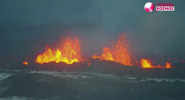 Τα πύρινα ποτάμια ρέουν από το ηφαίστειο στην χερσόνησο Ρέικιανες στην Ισλανδία. Η λάβα εκτοξεύεται σε ύψος ακόμα και εκατό μέτρων.