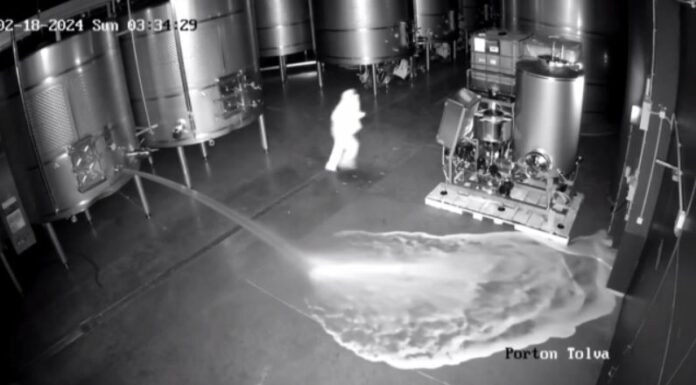 Ο άγνωστος, ο οποίος είχε καλυμμένα τα χαρακτηριστικά του όπως φαίνεται και στο βίντεο που κάνει τον γύρο του διαδικτύου, άνοιξε επίτηδες τις κάνουλες πέντε δεξαμενών κρασιού, με αποτέλεσμα να χυθούν τουλάχιστον 60.000 λίτρα κρασιού.