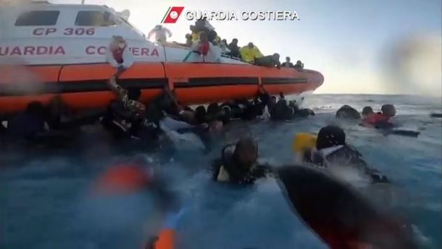 Οι πρόσφυγες από τη βόρεια Αφρική ζητούν βοήθεια από τους Ιταλούς ακτοφύλακες και αυτοί τους πετούν σωσίβια.