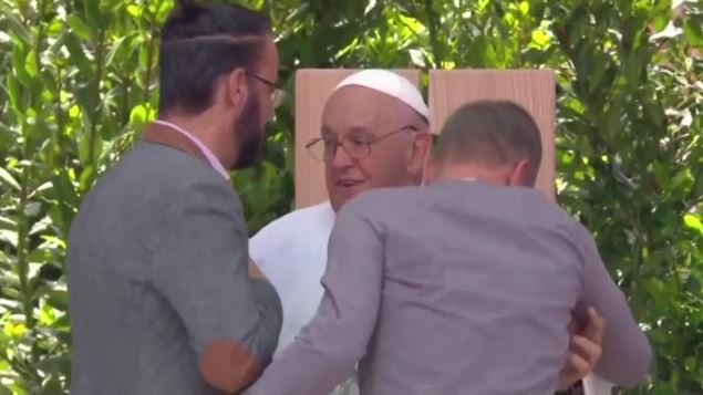 Λίγο μετά την άφιξή του, ένας Ισραηλινός, ο οποίος έχασε τους γονείς του κατά την επίθεση της Χαμάς στις 7 Οκτωβρίου, και ένας Παλαιστίνιος, ο αδελφός του οποίου δολοφονήθηκε σε επιχείρηση του ισραηλινού στρατού, αγκαλιάστηκαν μπροστά στον Ποντίφικα.