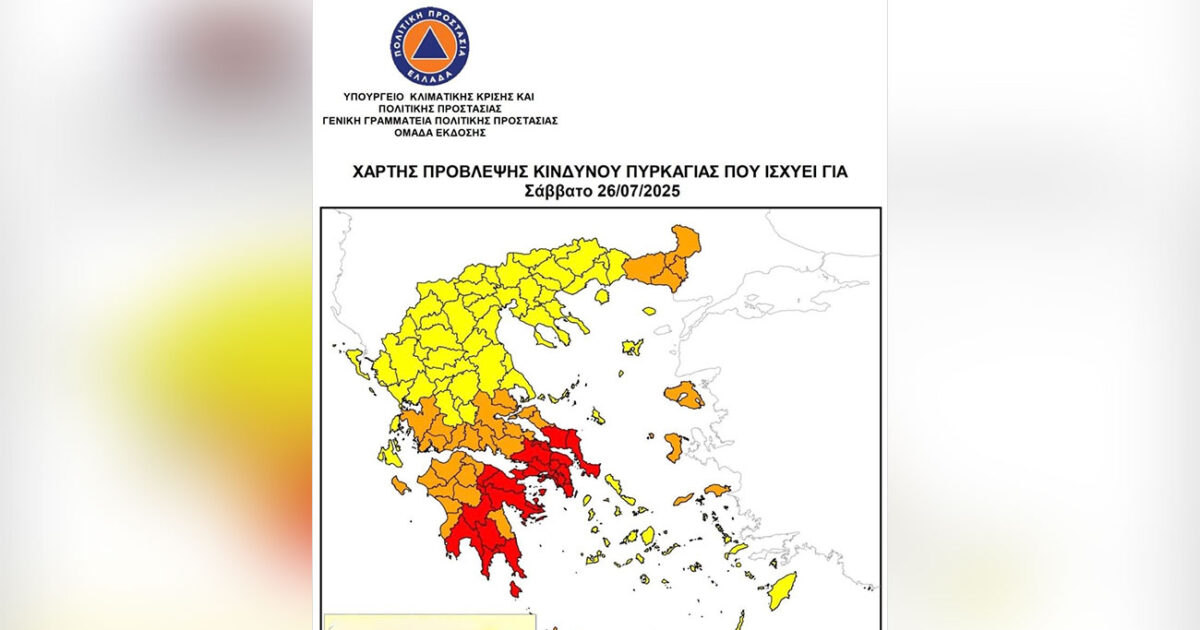 Το Υπουργείο Κλιματικής Κρίσης και Πολιτικής Προστασίας εξέδωσε προειδοποίηση για ακραίο κίνδυνο πυρκαγιάς (κατηγορία κινδύνου 5) για αύριο, Σάββατο 26 Ιουλίου 2025. Η κατάσταση είναι ακραία, με τον κίνδυνο να ξεπερνά κάθε προηγούμενο φετινό επίπεδο.
