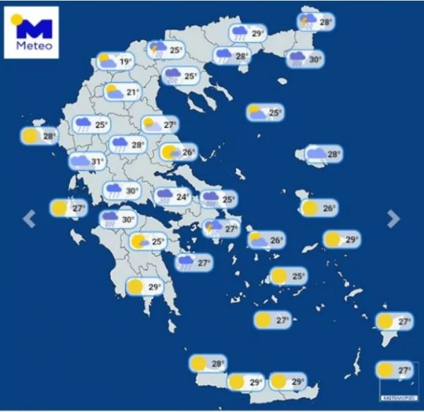Συγκεκριμένα αναμένεται πτώση της θερμοκρασίας το Σαββατοκύριακο, με τις μέγιστες τιμές να μην ξεπερνούν τους 29 με 30 βαθμούς Κελσίου, ενώ θα σημειωθούν βροχές και καταιγίδες.