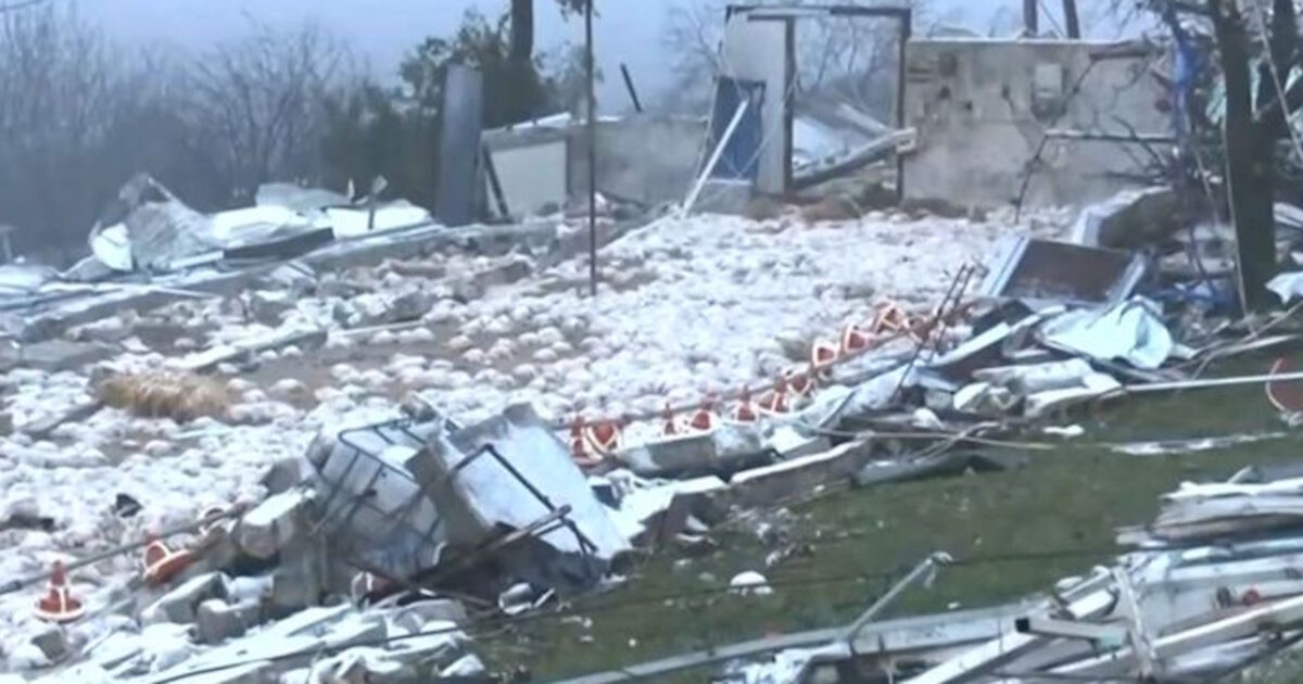 Ο ανεμοστρόβιλος ξήλωσε τις στέγες από τρία κτίρια της πτηνοτροφικής μονάδας. Στη συνέχεια κατέρρευσαν οι τοίχοι και καταπλάκωσαν τα κοτόπουλα. Σε πλάνα από drone φαίνονται οι διαστάσεις της καταστροφής. Παντού νεκρά κοτόπουλα σε έναν σορό από συντρίμμια.