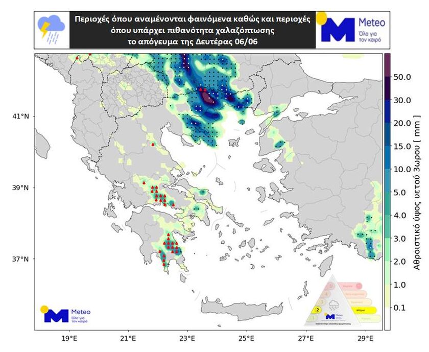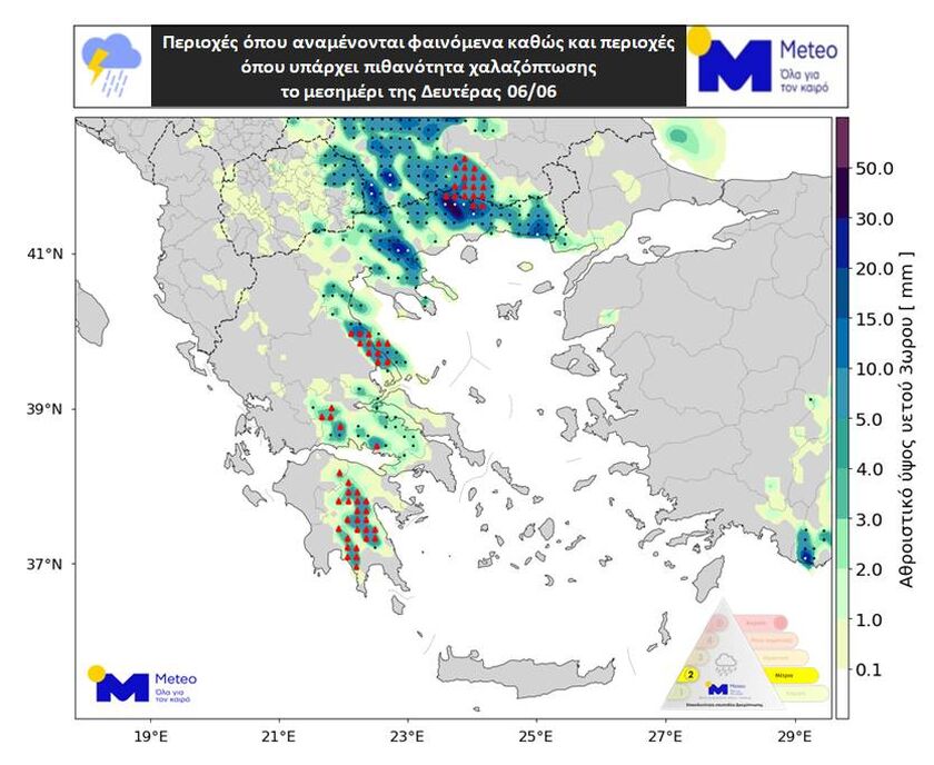 Για τη Δευτέρα 6 Ιουνίου 2022 προβλέπονται λίγες νεφώσεις αυξημένες στα βόρεια τμήματα με βροχές και τοπικές καταιγίδες στη Μακεδονία και στη Θράκη, όπου τις θερμές ώρες της ημέρας στην Ανατολική Μακεδονία και στη Θράκη θα είναι ισχυρές και θα συνοδευτούν από τοπικές χαλαζοπτώσεις, καθώς ξεκινά το φαινόμενο της ψυχρής λίμνης.