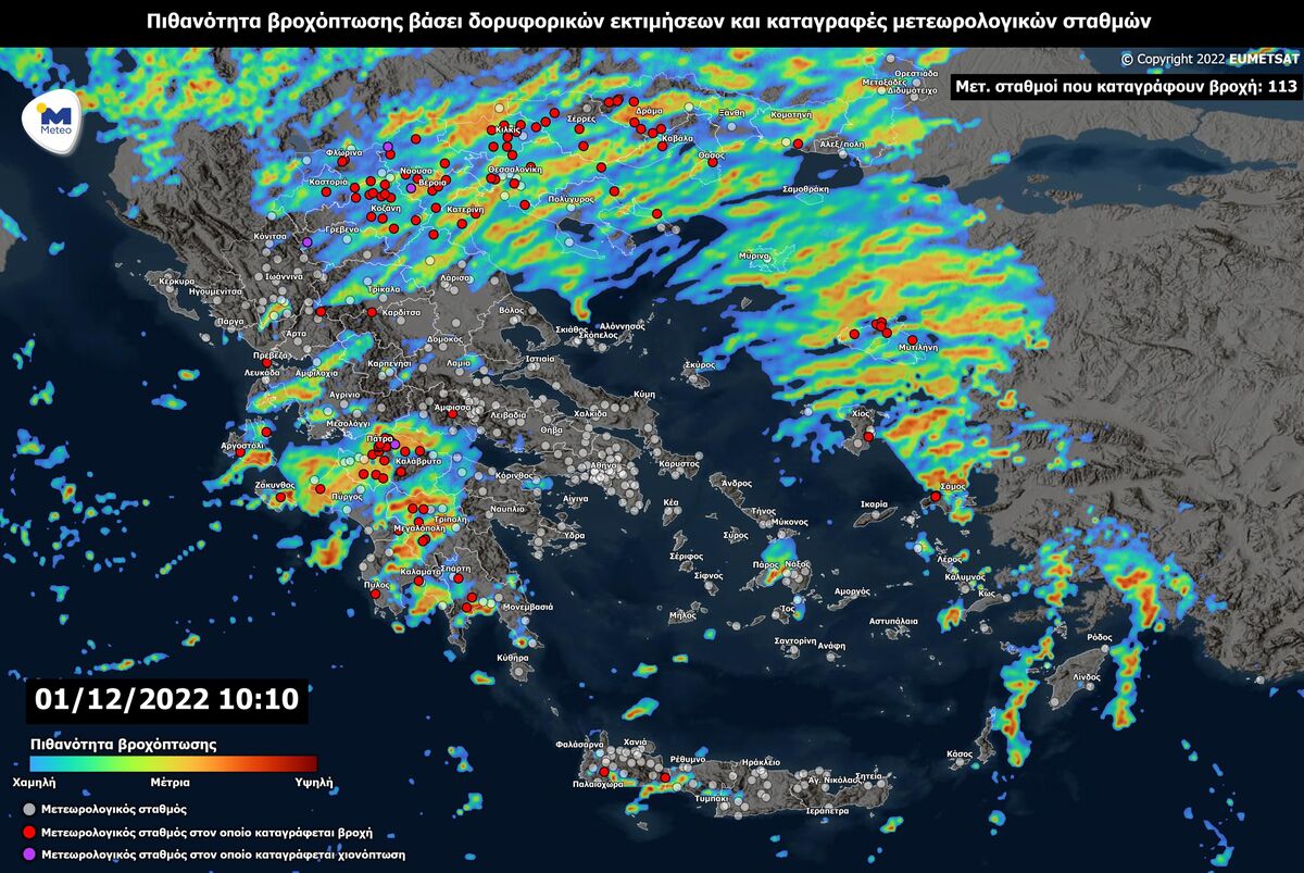 Στην παραπάνω εικόνα παρουσιάζονται οι περιοχές όπου υπήρξε πιθανότητα βροχόπτωσης καθώς και οι σταθμοί όπου καταγράφηκε βροχόπτωση κατά το διάστημα 09:15 – 10:10 της Πέμπτης 01/12.