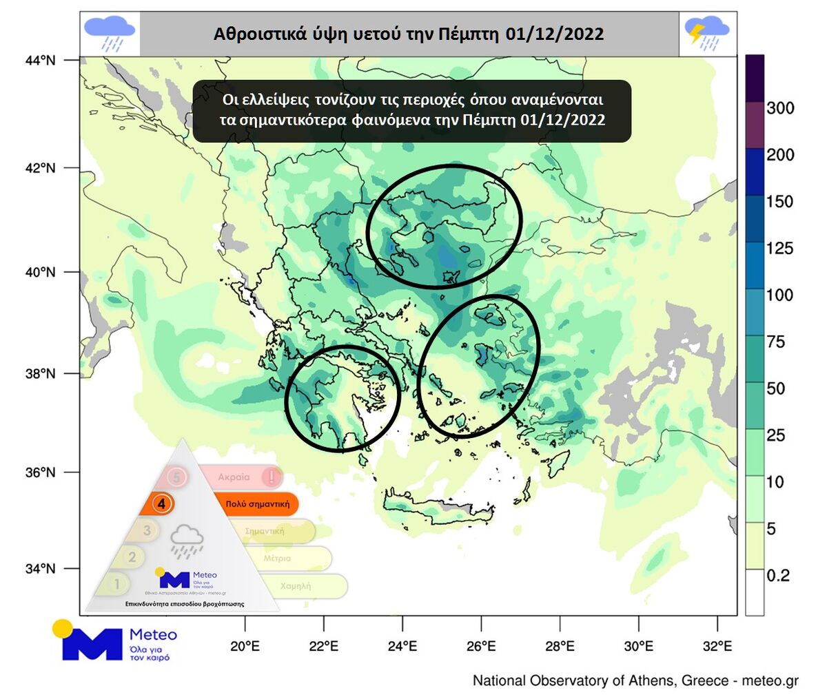 Σύμφωνα με τα προγνωστικά στοιχεία το, για το υπόλοιπο της ημέρας τα φαινόμενα θα συνεχιστούν ιδιαίτερα στη Βόρεια Ελλάδα και σε νησιωτικά τμήματα του Αιγαίου, ενώ στις υπόλοιπες περιοχές μέχρι αργά το βράδυ θα σταματήσουν. Στον προγνωστικό χάρτη που ακολουθεί αποτυπώνεται ο εκτιμώμενος αθροιστικός υετός κατά της διάρκεια της Πέμπτης 01/12.
