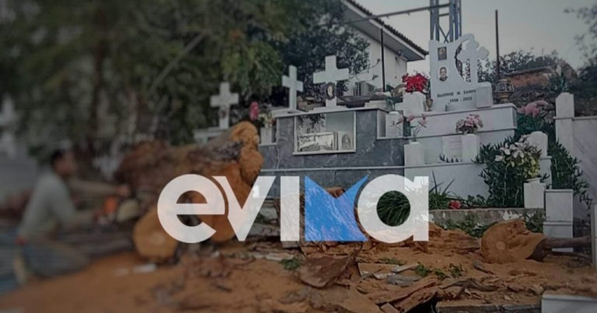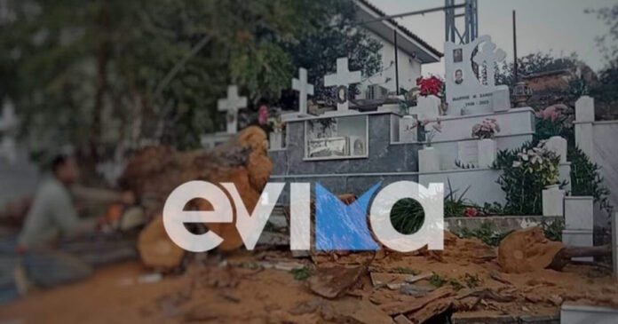 Συγκεκριμένα ένα μεγάλο ξερό πεύκο, που βρισκόταν εντός του νεκροταφείου στην Εύβοια, έπεσε, εξαιτίας των άσχημων καιρικών συνθηκών. Από την πτώση του δέντρου καταστράφηκαν δύο τάφοι, με τις εικόνες να προκαλούν μεγάλη θλίψη στους συγγενείς.