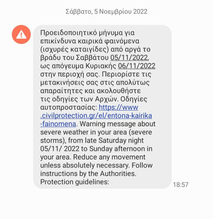 «Προειδοποιητικό μήνυμα για επικίνδυνα καιρικά φαινόμενα (ισχυρές καταιγίδες) από αργά το βράδυ του Σαββάτου 5/11/2022 ως απόγευμα της Κυριακής 6/11/2022 στην περιοχή σας.