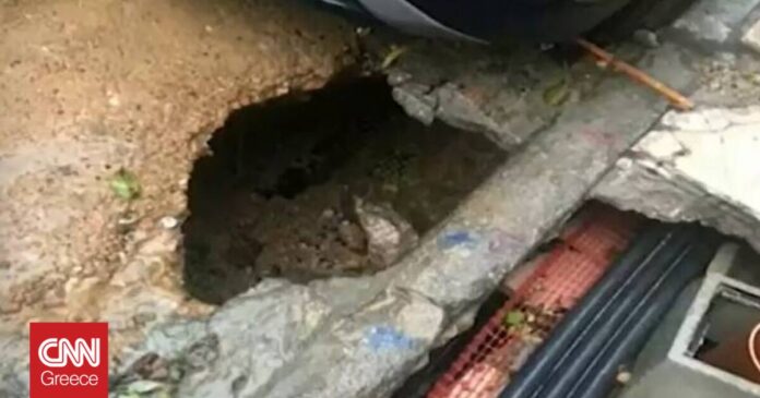 Το περιστατικό συνέβη λίγο μετά τις 10 το πρωί, όταν εξαιτίας της σφοδρής βροχόπτωσης, υποχώρησε το οδόστρωμα και άνοιξε η τρύπα.