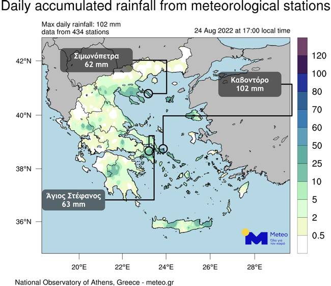 Σύμφωνα με δεδομένα από το πυκνό δίκτυο αυτόματων μετεωρολογικών σταθμών του Εθνικού Αστεροσκοπείου Αθηνών/meteo.gr, το μεγαλύτερο ύψος βροχής στην χώρα μας ήταν ίσο με 102mm και καταγράφηκε στο μετεωρολογικό σταθμό στο Κάβοντορο.