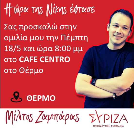 Σας προσκαλώ την Πέμπτη 18 Μαΐου και ώρα 8:00 μμ στην ομιλία μου που θα πραγματοποιηθεί στο Café Centro στο Θέρμο
