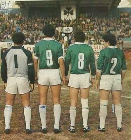 Οι πρωταγωνιστές του Παναθηναϊκού, στο πρώτο ματς που έδωσαν οι «πράσινοι» το 1982 στο γήπεδο της Λεωφόρου. Από αριστερά ποζάρουν (με γυρισμένη την πλάτη) ο Βασίλης Κωνσταντίνου, ο Γρηγόρης Χαραλαμπίδης, ο Άγγελος Αναστασιάδης και ο Γιάννης Κυράστας.