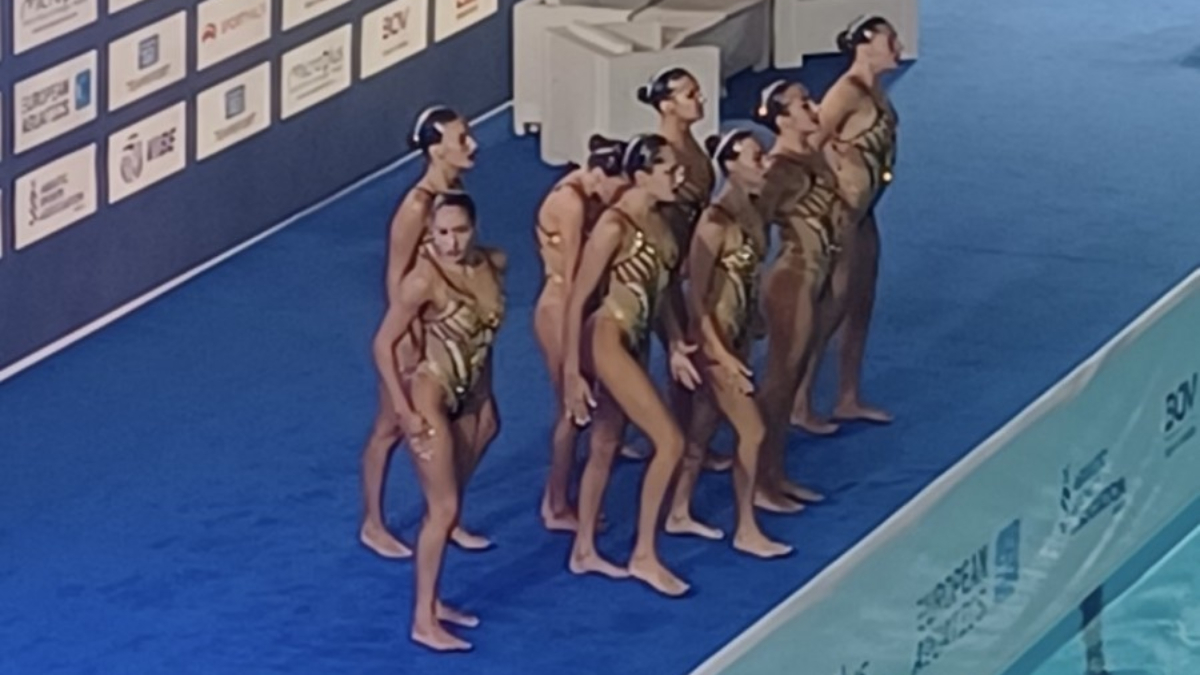 Οι Ζωή Καράγγελου, Βασιλική Θάνου, Σοφία Ρηγάκου, Θάλεια Δαμπάλη, Εστέλλα Καραμανίδου, Αθηνά Καμαρινοπούλου, Όλγα Ιμβριώτη και Άρτεμη Κουτράκη αγωνίστηκαν τα ξημερώματα στον απευθείας τελικό του αγωνίσματος και συγκέντρωσαν 283.4785 βαθμούς. Το χρυσό μετάλλιο πήρε η Κίνα με 305.3328β. και ακολούθησαν η Ιαπωνία (303.8268β.) και η Ισπανία (299.3034β.).