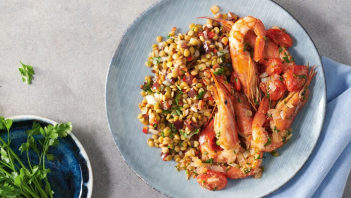Μια υπέροχη σαλάτα με φακές, πλούσια και θρεπτική που συνοδεύεται από υπέροχες γαρίδες!