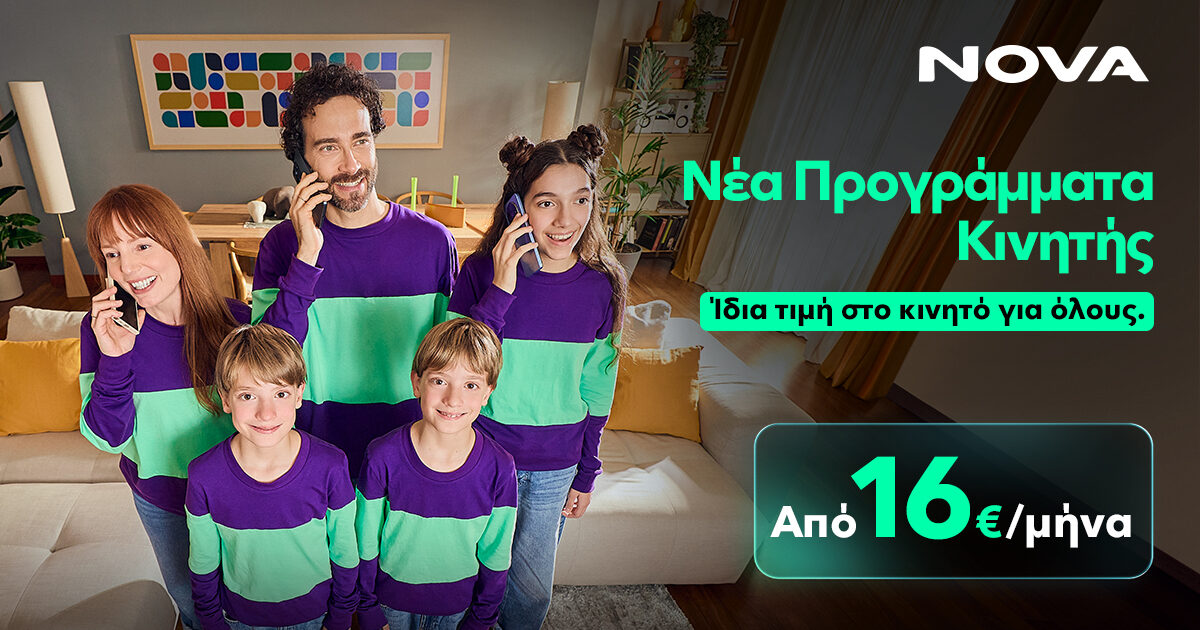 Και το ακόμα πιο σημαντικό; Τώρα μπορούμε να αποκτήσουμε πρόγραμμα κινητής από μόνο 16€ τον μήνα, ειδικά όταν συνδυάζουμε περισσότερα από δύο συμβόλαια Κινητής ή Σταθερής στη Nova. Μία τιμή που κουμπώνει ιδανικά με το concept «όλοι μαζί», γιατί ακριβώς εκεί βρίσκεται το κέρδος: όσο περισσότερες υπηρεσίες συγκεντρώνουμε στη Nova, τόσο περισσότερα χρήματα εξοικονομούμε στο κινητό..