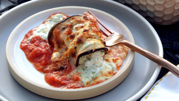 Αφήνετε τους κύβους μελιτζάνας σε νερό με αλάτι να ξεπικρίσουν, όσο ετοιμάζετε τα υπόλοιπα υλικά (τομάτα, ανθότυρο, τυριά). Τους στραγγίζετε καλά και τους σοτάρετε στο μισό ελαιόλαδο. Τους αφήνετε σε χαρτί κουζίνας. Προσθέτετε το υπόλοιπο λάδι και σοτάρετε τα κυβάκια τομάτας. Βάζετε τους κύβους μελιτζάνας και ντομάτας μέσα σε ένα μπολ.