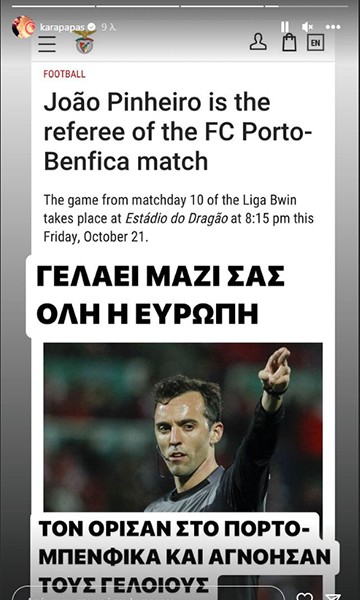 Ο αντιπρόεδρος και γενικός διευθυντής της ΠΑΕ Ολυμπιακός, Κώστας Καραπαπάς, με ανάρτησή του στα social media σχολίασε τον ορισμό του Πινέιρο στο πορτογαλικό ντέρμπι και εξέθεσε στα μάτια της φίλαθλης κοινής γνώμης τον πρόεδρο της ΕΠΟ, Τάκη Μπαλτάκο.
