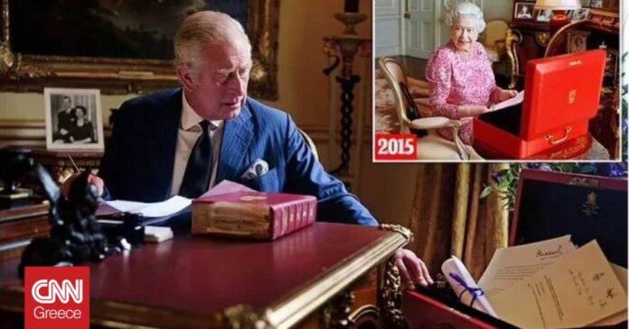 Με το κόκκινο βαλιτσάκι που περιέχει έγγραφα από υπουργούς της κυβέρνησης στο Ηνωμένο Βασίλειο και άλλα χειρόγραφα, φωτογραφήθηκε για πρώτη φορά ο νέος βασιλιάς της χώρας, Κάρολος Γ’.