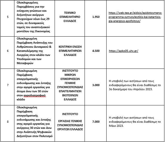 Συνολικά, 23.830 ευκαιρίες για την ανάπτυξη επαγγελματικών δεξιοτήτων έχουν 9.330 άνεργοι νέοι έως 29 ετών και 14.500 ανέργοι άνω των 30 ετών, μέσα από οκτώ επιδοτούμενα προγράμματα κατάρτισης, τα οποία είναι διαθέσιμα την τρέχουσα χρονική περίοδο για τους εγγεγραμμένους στα Μητρώα της Δημόσιας Υπηρεσίας Απασχόλησης (ΔΥΠΑ).