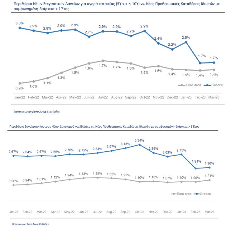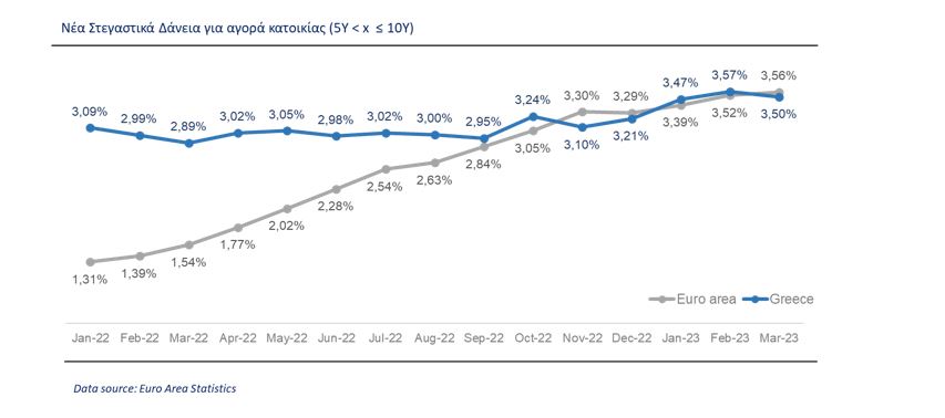 Σε ότι αφορά τα νέα δάνεια, και εστιάζοντας στα στεγαστικά δάνεια διάρκειας 5 έως 10 ετών, το επιτόκιο τον Μάρτιο μειώθηκε στην Ελλάδα κατά 7 μ.β. στο 3,50%. Στην Ευρωζώνη, το μέσο επιτόκιο για την ίδια κατηγορία στεγαστικών δανείων ήταν 3,56%, έναντι 1,54% πριν από ένα χρόνο (Μάρτιος 2022). Το επιτόκιο στο σύνολο των δανείων των νοικοκυριών το Μάρτιο μειώθηκε κατά 4μ.β. στην Ελλάδα, στο 3,79% ενώ στην Ευρωζώνη αυξήθηκε κατά 13μ.β. στο 3.37%, έναντι 1,47% πριν από ένα χρόνο (Μάρτιος 2022).