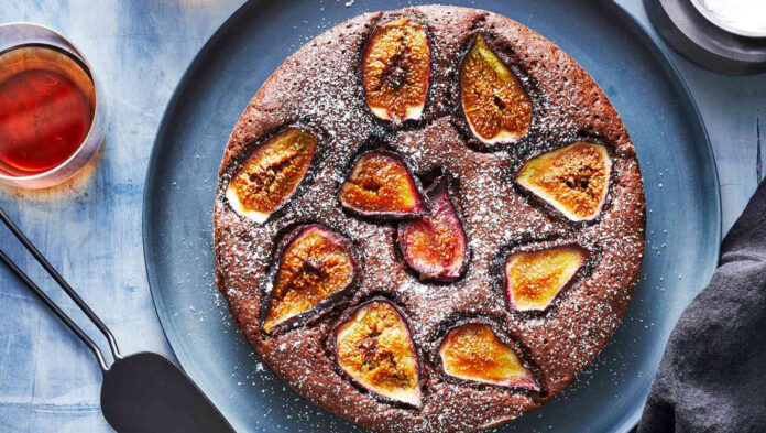 Περιχύστε το μείγμα στη φόρμα για κέικ και πάνω από τα σύκα και ψήστε στους 185°C για περίπου 35 λεπτά