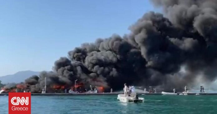 Οι πυροσβέστες δίνουν μάχη για την απομάκρυνση σκαφών, προκειμένου να μην επεκταθεί περισσότερο η φωτιά.