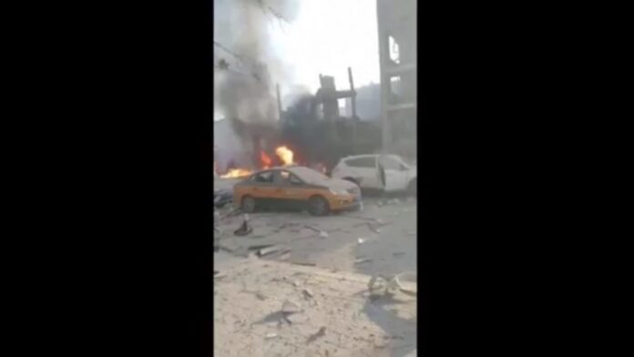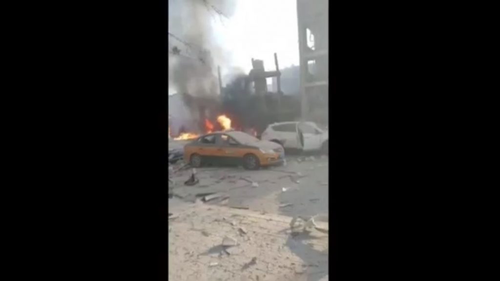 Κάμερα στο παρμπρίζ αυτοκινήτου καταγράφει την έκρηξη σε εστιατόριο, στο Χεμπέι της Κίνας. Το εστιατόριο αλλά και τα αυτοκίνητα που είναι σταθμευμένα έξω από αυτό καταστρέφονται ολοσχερώς.