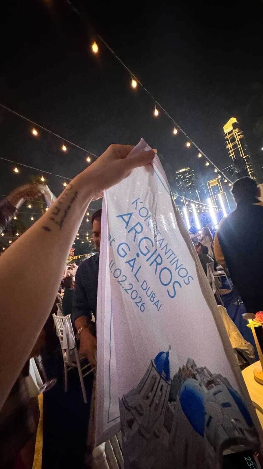 Στο Dubai όμως είναι άλλο το level. Τι πετσέτες και χαρτοπετσέτες. Για την εμφάνιση του Αργυρού στο Gal Dubai το απίθανο μαγαζί με φόντο το Burj Khalifa που φιλοξενεί αρκετά συχνά Έλληνες καλλιτέχνες φτιάχτηκαν ειδικά μαντήλια λευκά, με μπλε μπορντούρα περίγραμμα, με τυπωμένο το όνομα του… Konstantinos Argiros, το μαγαζί, την ημερομηνία της εμφάνισής του 11/2/2026 και δεξιά λίγο Ελλάδα με μια εικόνα μια εκκλησιάς σε νησί, μάλλον Σαντορίνη σε μπλε και λευκό…