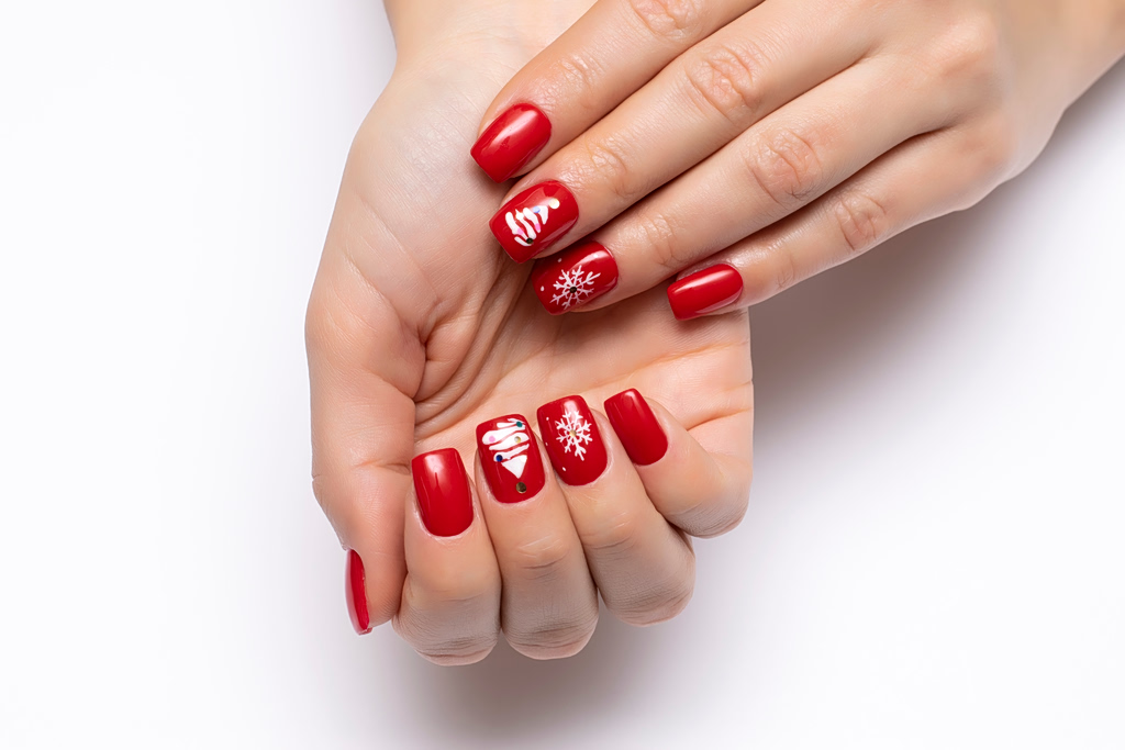 Ένα άλλο μίνιμαλ και άκρως γιορτινό nail look που μπορείτε να κάνετε είναι το συγκεκριμένο που βάζει τις χιονονιφάδες σε πρώτο πλάνο. Μόνο που δεν έχουν το κλασικό λευκό χρώμα, αλλά μεταλλικό κόκκινο κάνοντας πιο λαμπερό το μανικιούρ σας.