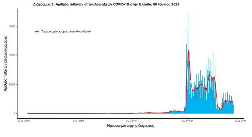 Ο αριθμός πιθανών νέων επαναλοιμώξεων που καταγράφηκαν τις τελευταίες 24 ώρες ήταν 300 ενώ από την αρχή της πανδημίας SARS-CoV-2 ο συνολικός αριθμός εκτιμάται σε 138.152(3.8% του συνολικού αριθμού των θετικών αποτελεσμάτων).