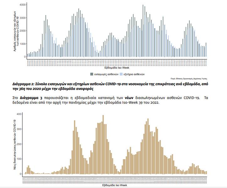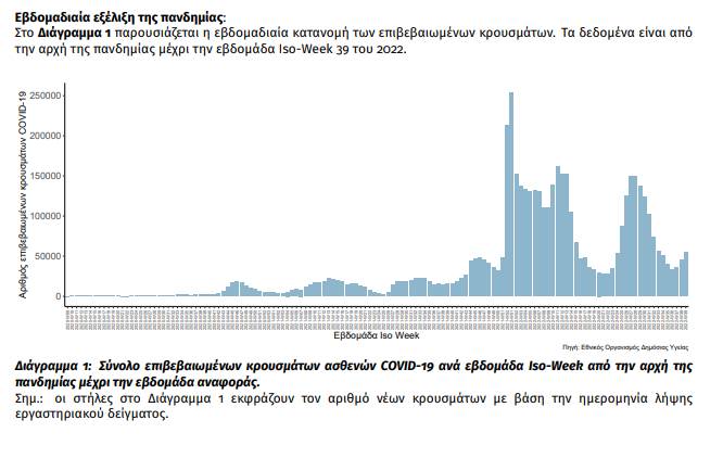 Τα στοιχεία που παρουσιάζονται αφορούν περιστατικά από την επιδημιολογική επιτήρηση της νόσου από το νέο κορωνοϊό (COVID-19). Τα δεδομένα αφορούν την εβδομάδα αναφοράς ISO 39/2022 (26 Σεπτεμβρίου 2022 – 02 Οκτωβρίου 2022). 1 Την εβδομάδα αναφοράς καταγράφηκαν 54.649 κρούσματα COVID-19 (5.238 ανά εκατoμμύριο πληθυσμού: 22% εβδομαδιαία μεταβολή) εκ των οποίων οι επαναλοιμώξεις αφορούν το 25% των λοιμώξεων.
