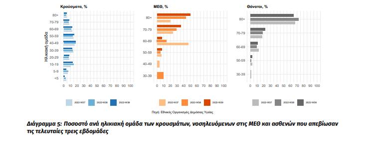 Στο Διάγραμμα 5 παρουσιάζεται το ποσοστό ανά ηλικιακή ομάδα των κρουσμάτων, νοσηλευόμενων στις MEΘ και ασθενών που απεβίωσαν τις τελευταίες τρεις εβδομάδες.