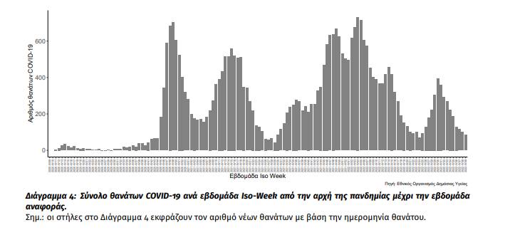 Την εβδομάδα αναφοράς καταγράφηκαν 85 θάνατοι ασθενών COVID-19 (8 ανά εκατομμύριο πληθυσμού: -15% εβδομαδιαία μεταβολή) εκ των οποίων οι 24 (28%) απεβίωσαν μετά την παρέλευση τουλάχιστον 29 ημερών από την ημερομηνία εργαστηριακής επιβεβαίωσης της λοίμωξης COVID-19, ενώ από την έναρξη της επιδημίας έχουν καταγραφεί συνολικά 33.200 θάνατοι, με το 96.0% είχε υποκείμενο νόσημα ή/και ηλικία 70 ετών και άνω.