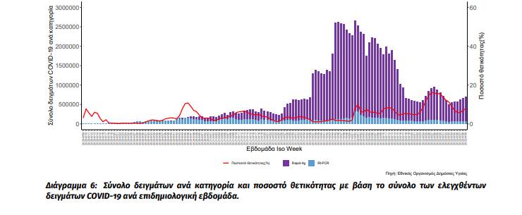 Δείγματα που έχουν ελεγχθεί: Την εβδομάδα αναφοράς, το ποσοστό θετικότητας ήταν 7,85% σε σύνολο 695.904 εργαστηριακών ελέγχων (RT-PCR/Rapid-Ag) με το μέσο όρο επταημέρου να είναι 99.415 δείγματα (5% εβδομαδιαία μεταβολή).