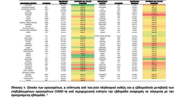 Κατανομή κρουσμάτων την εβδομάδα αναφοράς: Στον Πίνακα 1 παρουσιάζεται τo σύνολο των κρουσμάτων, η επίπτωση ανά 100.000 πληθυσμού καθώς και η εβδομαδιαία μεταβολή των επιβεβαιωμένων κρουσμάτων COVID-19 ανά περιφερειακή ενότητα την εβδομάδα αναφοράς σε σύγκριση με την προηγούμενη εβδομάδα.