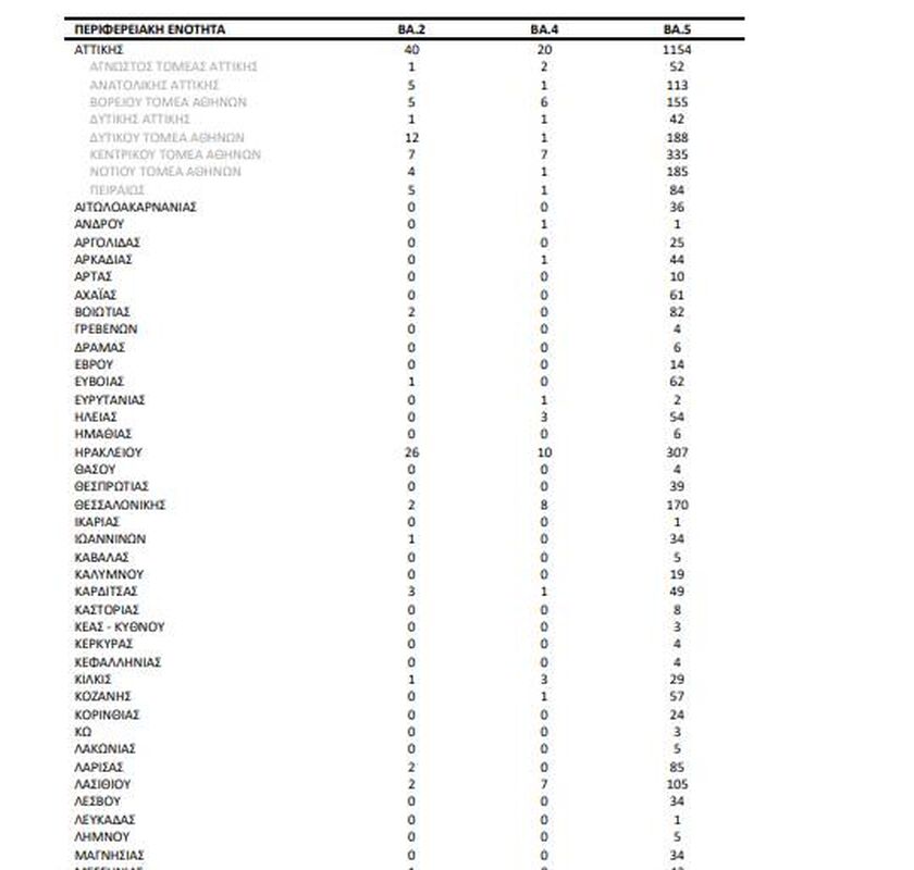 «Στην παρούσα αναφορά περιλαμβάνονται αποτελέσματα ανάλυσης από το Eθνικό Δίκτυο Γονιδιωματικής Επιτήρησης του ιού SARS-CoV-2, που λειτουργεί υπό το συντονισμό του ΕΟΔΥ, από 629 δείγματα που έχουν επιλεγεί τυχαιοποιημένα ή στοχευμένα και αφορούν στην περίοδο 01 Σεπτεμβρίου 2022 έως 18 Οκτωβρίου 2022. Από όλα τα δείγματα απομονώθηκε στέλεχος Omicron (B.1.1.529). Δέκα εξ αυτών ταυτοποιήθηκαν ως BQ.1 και 5 ως ΒQ.1.1 (υπο-παραλλαγές της ΒΑ.5), ενώ 35 ταυτοποιήθηκαν ως υποπαραλλαγή της BA.2 (BA.2.75). Συνολικά, έως τώρα έχουν ταυτοποιηθεί 66 στελέχη με υπο-παραλλαγή BA.2.75.