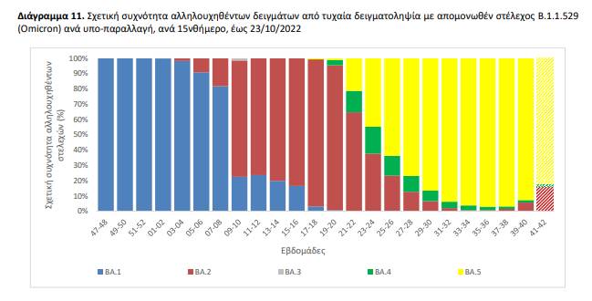 Στο Διάγραμμα 11 απεικονίζεται η διαχρονική εξέλιξη της σχετικής συχνότητας εμφάνισης των υποπαραλλαγών του στελέχους Omicron. Κατά τη διάρκεια του διμήνου πριν τις 18 Οκτωβρίου 2022, οι δύο πιο συχνές υποπαραλλαγές του στελέχους Omicron που απομονώθηκαν από εγχώρια δείγματα από τυχαία δειγματοληψία ήταν το BA.5 με ποσοστό 95,5%, ακολουθούμενο από το BA.2 με ποσοστό 2,6%».