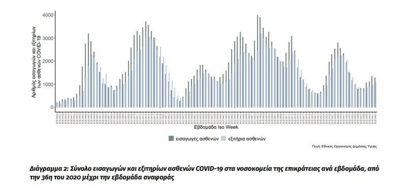 Το σύνολο των εισαγωγών, στα νοσοκομεία της επικράτειας, την εβδομάδα αναφοράς ήταν 1.291 ασθενείς (7μερος μ.ό.: 184, -5% εβδομαδιαία μεταβολή), ενώ το σύνολο των εξιτηρίων ανέρχεται σε 1.095 ασθενείς (7μερος μ.ο.: 156, 13% εβδομαδιαία μεταβολή). Ο αριθμός των ασθενών που νοσηλεύονται διασωληνωμένοι μέχρι τέλος της εβδομάδας αναφοράς είναι 82 (65.9% άνδρες) με διάμεση ηλικία 74 έτη και το 97.6% να έχει υποκείμενο νόσημα ή/και ηλικία 70 ετών και άνω.