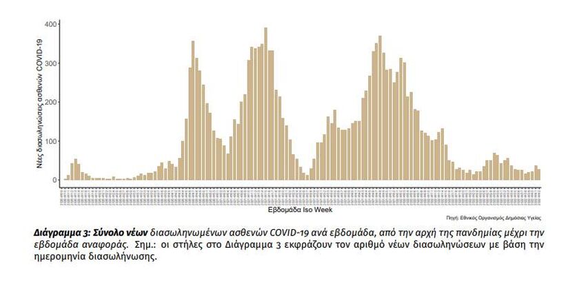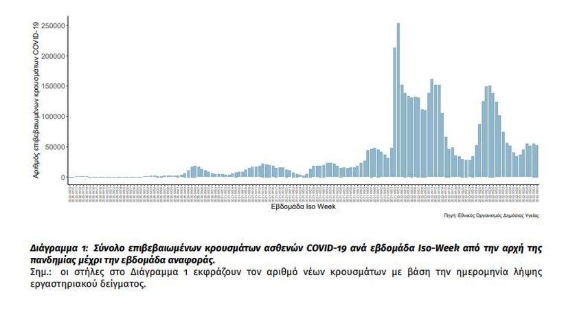 «Την εβδομάδα αναφοράς καταγράφηκαν 52.966 κρούσματα COVID-19 (5.077 ανά εκατoμμύριο πληθυσμού: -4% εβδομαδιαία μεταβολή) εκ των οποίων οι επαναλοιμώξεις αφορούν το 22% των λοιμώξεων. Ο συνολικός αριθμός των λοιμώξεων από την έναρξη της πανδημίας ανέρχεται σε 5.135.200 εκ των οποίων 52.1% γυναίκες.