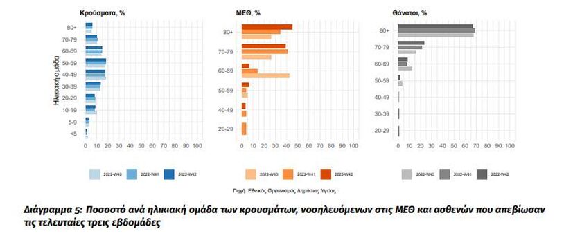 Την εβδομάδα αναφοράς καταγράφηκαν 138 θάνατοι ασθενών, ενώ από την έναρξη της επιδημίας έχουν καταγραφεί συνολικά 33.574 θάνατοι, με το 96.0% είχε υποκείμενο νόσημα ή/και ηλικία 70 ετών και άνω.