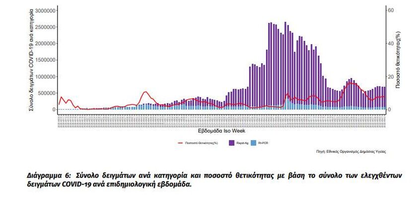 Δείγματα που έχουν ελεγχθεί: Την εβδομάδα αναφοράς, το ποσοστό θετικότητας ήταν 7,66% σε σύνολο 691.863 εργαστηριακών ελέγχων (RT-PCR/Rapid-Ag) με το μέσο όρο επταημέρου να είναι 98.838 δείγματα (0% εβδομαδιαία μεταβολή).