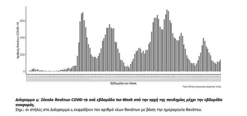 Την εβδομάδα αναφοράς καταγράφηκαν 138 θάνατοι ασθενών COVID-19 (13 ανά εκατομμύριο πληθυσμού: 23% εβδομαδιαία μεταβολή) εκ των οποίων οι 14 (10%) απεβίωσαν μετά την παρέλευση τουλάχιστον 29 ημερών από την ημερομηνία εργαστηριακής επιβεβαίωσης της λοίμωξης COVID-19, ενώ από την έναρξη της επιδημίας έχουν καταγραφεί συνολικά 33.574 θάνατοι, με το 96.0% είχε υποκείμενο νόσημα ή/και ηλικία 70 ετών και άνω.
