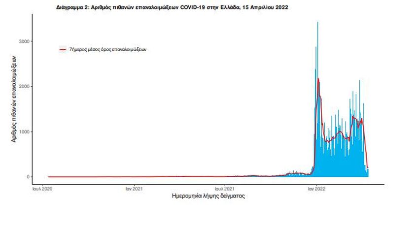 Ο αριθμός πιθανών νέων επαναλοιμώξεων που καταγράφηκαν τις τελευταίες 24 ώρες ήταν 180 ενώ από την αρχή της πανδημίας SARS-CoV-2 ο συνολικός αριθμός εκτιμάται σε 119.902(3.6% του συνολικού αριθμού των θετικών αποτελεσμάτων).