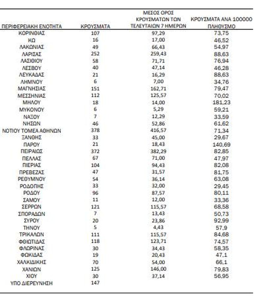 Αναλυτικά η κατανομή των κρουσμάτων στις περιφέρειες της χώρας έχει ως εξής: