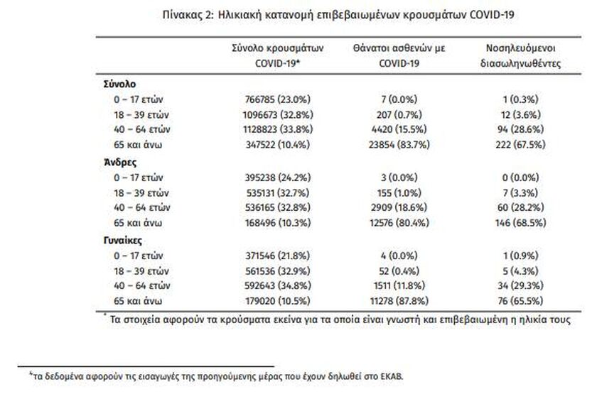«Τα νέα εργαστηριακά επιβεβαιωμένα κρούσματα της νόσου (άτομα) που καταγράφηκαν τις τελευταίες 24 ώρες ήταν 8.223. Ο συνολικός αριθμός των ατόμων που νόσησαν ανέρχεται σε 3.224.479 (ημερήσια μεταβολή +0.2%), εκ των οποίων 49.0% άνδρες.