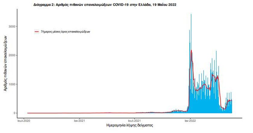 Ο αριθμός πιθανών νέων επαναλοιμώξεων που καταγράφηκαν τις τελευταίες 24 ώρες ήταν 453 ενώ από την αρχή της πανδημίας SARS-CoV-2 ο συνολικός αριθμός εκτιμάται σε 130.952(3.7% του συνολικού αριθμού των θετικών αποτελεσμάτων).